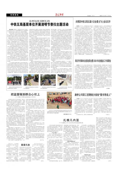 二公司伍铁公司组织党员干部、团员青年赴龙华烈士陵园开展清明祭英烈活动,全体人员列队肃立,深深三鞠躬后,依次上前敬献鲜花,表达对革命先烈的深切缅怀和崇高敬意。长赣高铁项目团支部组织青年团员赴湖南烈士公园开展主题团日活动,全体人员在烈士纪念塔前举行缅怀仪式,默哀致敬、敬献鲜花、重温入团誓词,并参观烈士纪念馆和“潇湘忠魂”陈列厅,学习湖南籍烈士的感人事迹。